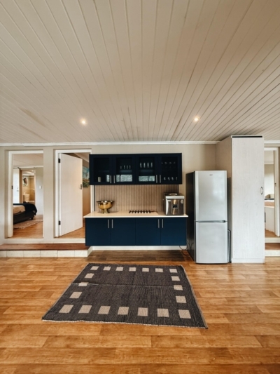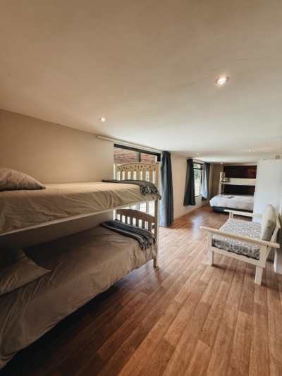 Four well-appointed bedrooms span the property, each with its own ensuite – some with King beds, others with queen and bunker beds. The downstairs bedroom opens directly onto the river, making it an ideal spot for kids or those who seek a touch of adventure, waking up to the sights and sounds of the water just steps away.