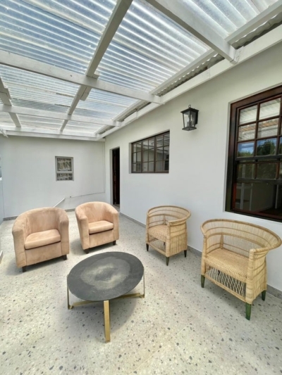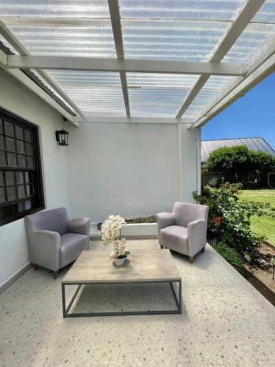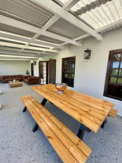 The fully equipped kitchen is a culinary haven, featuring two fridges, an oven, a dishwasher, and a coffee nook with an Espresto machine. Entertainment options abound at Brummer House. Inside, you’ll find an indoor braai area with a dining table, perfect for cosy nights indoors, as well as a relaxing lounging area with DSTV and a Bluetooth speaker. For summer days, a well-appointed veranda provides a lounging area for unwinding with a drink in hand, a dartboard for friendly competition, and an outdoor braai area.