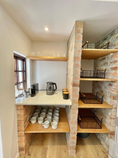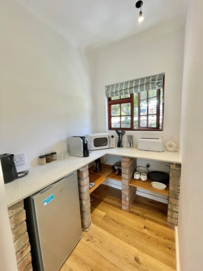 - Kitchenette with bar fridge, Espresso Machine, microwave, kettle, and crockery