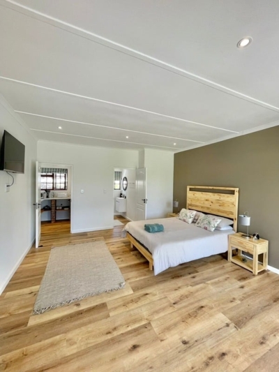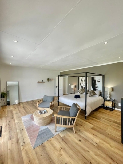The property boasts a thoughtfully arranged layout with four bedrooms within the main house and an additional fifth bedroom in the connected flatlet. The sleeping arrangements are as diverse as they are inviting, whether you are family or a group of friends. The main bedroom is a sanctuary of indulgence and comfort, embellished with Jan Blohm artwork, and a seating area with a private patio overlooking the river. The en-suite boasts a bathtub, perfect for unwinding after an eventful day on the river, or for little ones joining. The second bedroom on the ground floor contains a double bed, with an adjacent bathroom with a shower.