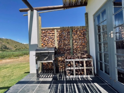 The cottage features two bedrooms, a bathroom with a shower, and an open-plan kitchen living area with a cozy fireplace. Outside, you’ll find an outdoor 6-seater dining area with a braai facility and umbrella, perfect for al-fresco dining while taking in the river views.