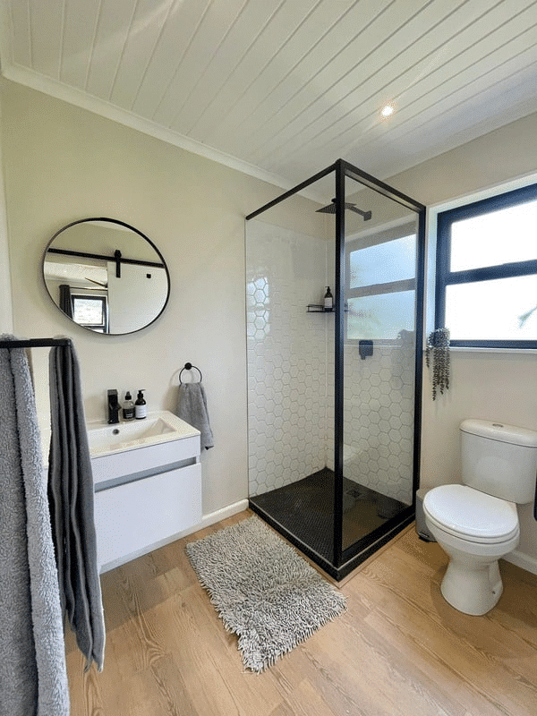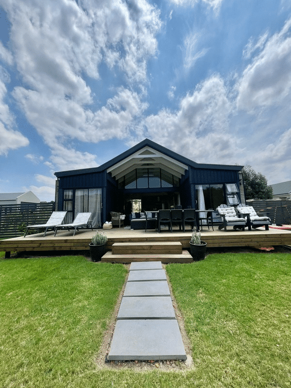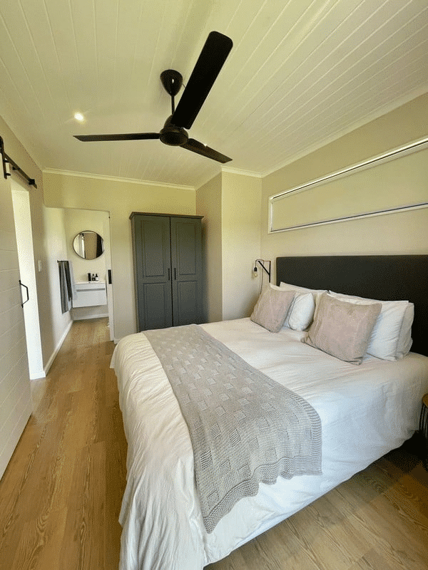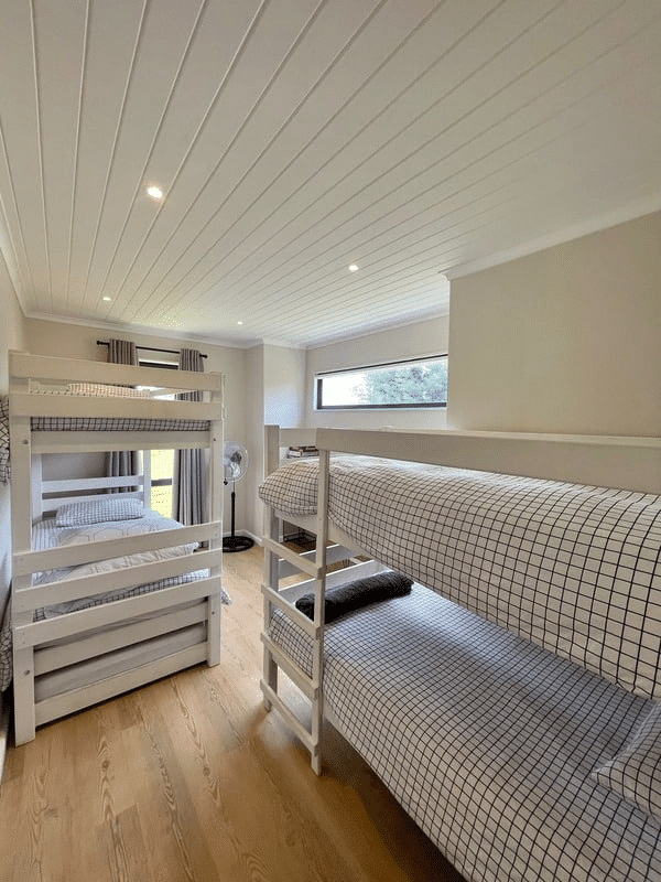 Four bedrooms span the property, three with queen beds, the fourth with two sets of bunker beds, each thoughtfully appointed with comfort and relaxation in mind. Bedrooms three and four lead directly onto the deck, offering easy access to the outdoors and uninterrupted river views.