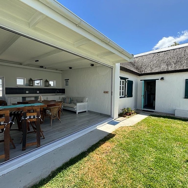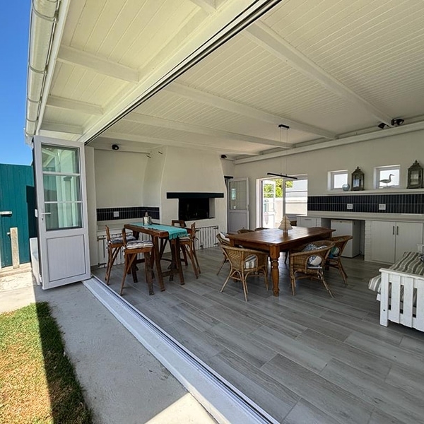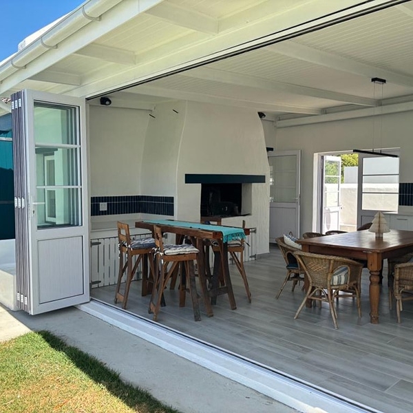 Discover coastal bliss at our fishermen-style cottage in Langezandt Estate, Struisbaai. With hues of white and blues mirroring the nearby beach, each corner tells a tale of seafaring adventures. Sink into cozy sofas by the crackling fireplace or bask in sunlight in the sun-drenched patio where hours of socializing await around the braai.