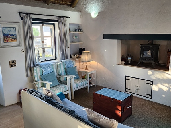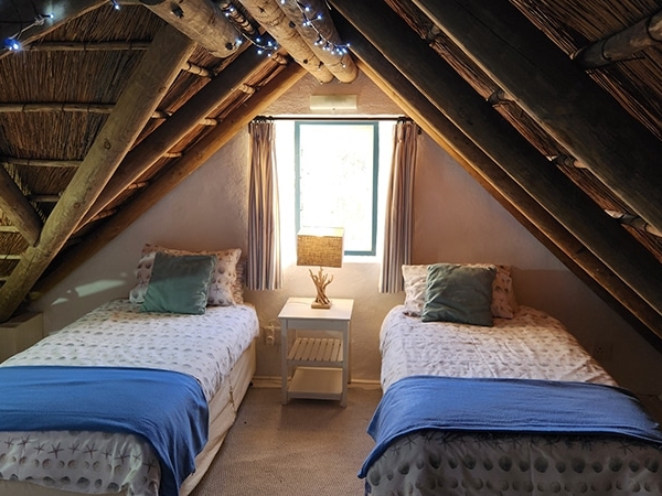 In the heart of the home, the living room invites you to sink into sofas with plush cushions in shades of cerulean and sapphire blue. A combustion fireplace, crackles merrily, casting a warm glow that dances upon the walls. Laughter and conversation flow freely, as friends and family gather to share stories and create memories that will linger long after the sun has set. Adjacent to the living room, the kitchen is a sanctuary of culinary creativity, where the aroma of freshly baked bread and sizzling seafood fills the air. Four versatile bedrooms complete the space, with a double main, two singles, a loft, and a cottage.