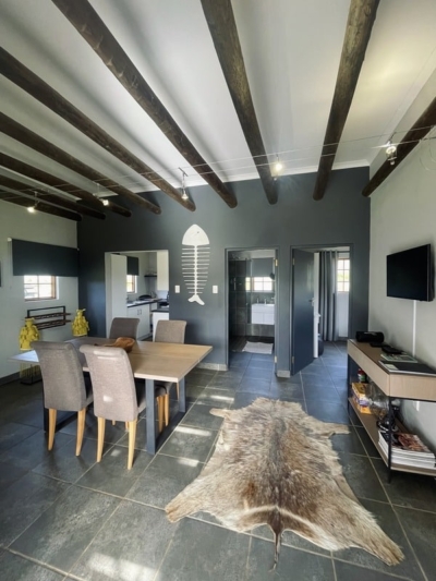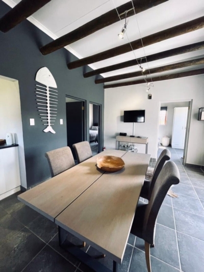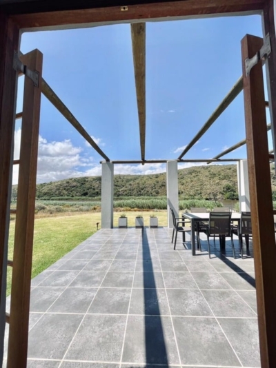 As you step onto the large porch overlooking the river, you’ll be greeted by the sights of the herons gracefully gliding across the water, their necks and elegant wings adding to the serene atmosphere. Inside, the cottage exudes tranquillity, with bright, open spaces that invite you to relax and unwind. Whether you’re sunbathing on the riverbank, kayaking along the water’s edge, or simply enjoying a leisurely stroll through the surrounding fynbos, there’s no shortage of activities to keep you entertained. Birdwatching enthusiasts will be delighted by the diverse array of birdlife that calls the Breede River home, while those looking for a bit more adventure can explore the nearby hiking trails, take a scenic boat ride along the river, or go horseback riding.