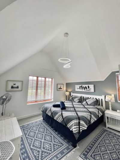 The spacious open-plan living, and kitchen area is the heart of the home, where laughter and conversation flow freely. The kitchen, equipped with all modern amenities, is a chef’s dream, while the dining area leads out onto a patio adorned with sun loungers and comfy sofas. Here, under the shade of the trees, you can enjoy leisurely meals or simply bask in the tranquillity of the river.