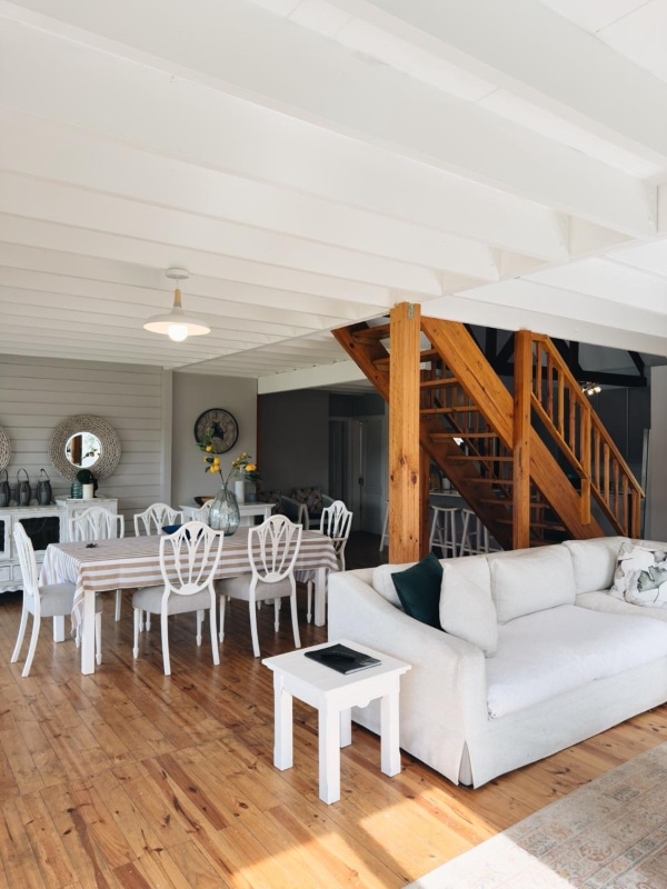 Five bedrooms, some en-suite and some with river views span the property, capturing the essence of a summer holiday reminiscent in the wooden interiors. Meticulously laid out, Wooden House creates spaces for resting, relaxing, reclining and revelling. Downstairs, the spacious open-plan, fully fitted kitchen, dining area and lounge create the hub of the home. As you make your way upstairs, the enchantment of the home is unveiled as a dining table, braai area and kitchenette fill the space. Here, plenty of hours filled with laughter, stories around the dining table and reminiscing about the days take place, creating a collection of cherished memories. As you glance out from the bay windows, the sunset casts a golden glow over the river and you make your way onto the balcony, feeling the warmth of the fading sunlight on your skin, and the gentle breeze that carries the scent of the river.